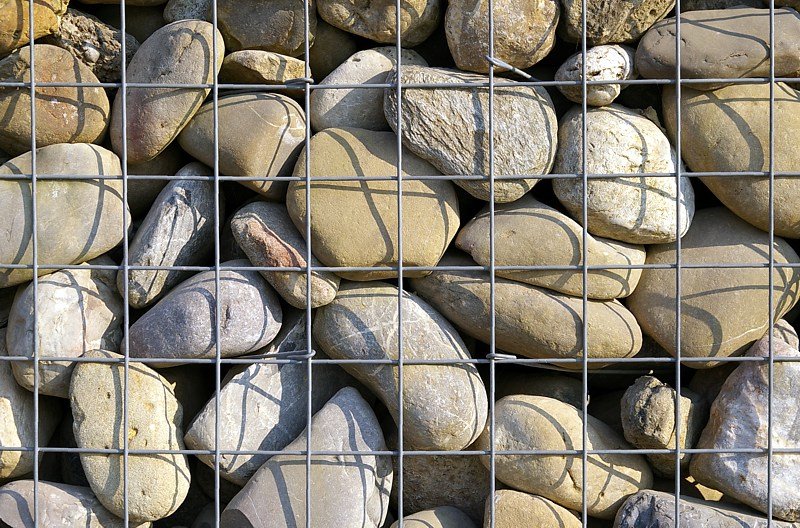 Hinter Gittern. Steinmauer am Rundweg im Seepark Linzgau, Pfullendorf. 13. April 2009