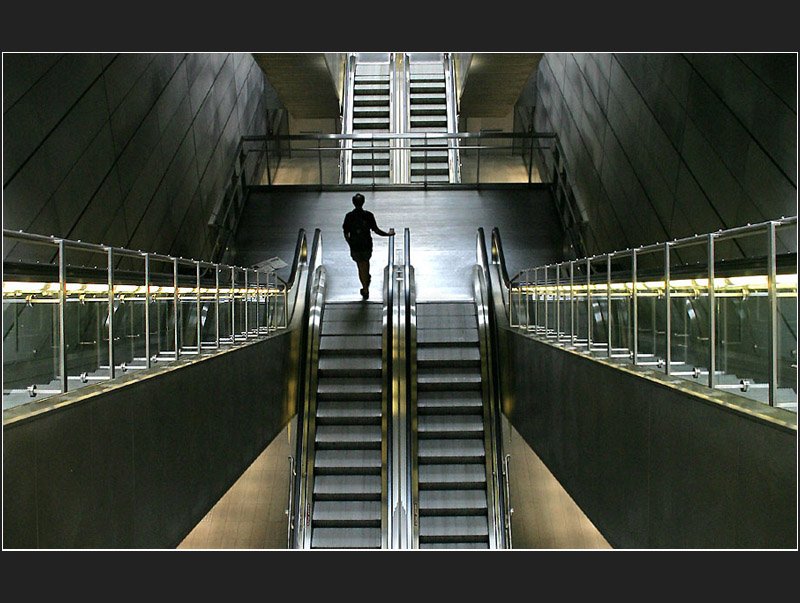 Eine Metrostation in Kopenhagen, von Jonas anders fotografiert. Im Vordergund die unter den Rolltreppenhandläufen angebrachte Beleuchtung, mehrfach gespiegelt in den Glasflächen.