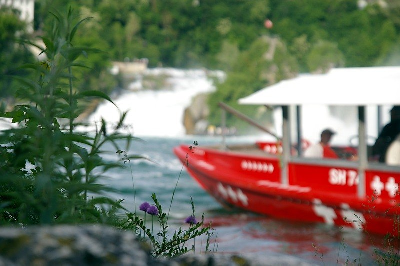 Einsames Blümchen am Rheinfall von Schaffhausen. Im Hintergrund eines der Schiffe, welches die Besucher auf den Felsen bringt. Fotografiert am 21. Mai 2009.