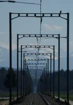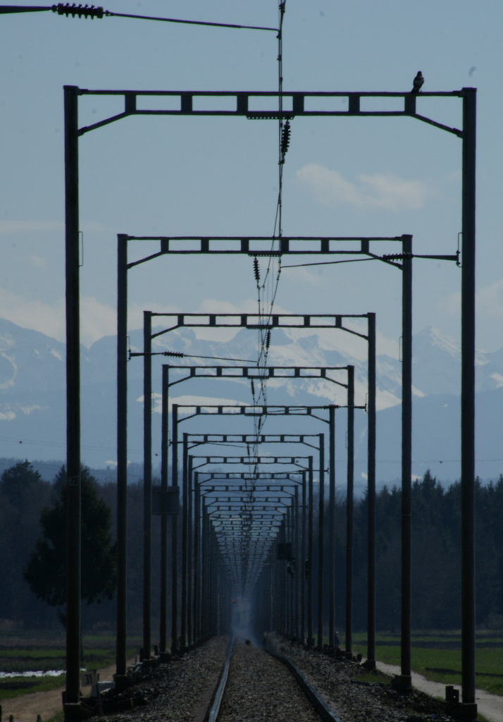 Dein Bild gefällt mir sehr gut: die grafische Wirkung der Oberleitungsanlage, die den Blick in die Ferne führen... und dahinter die Berg.