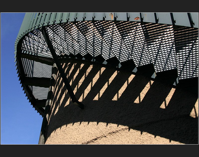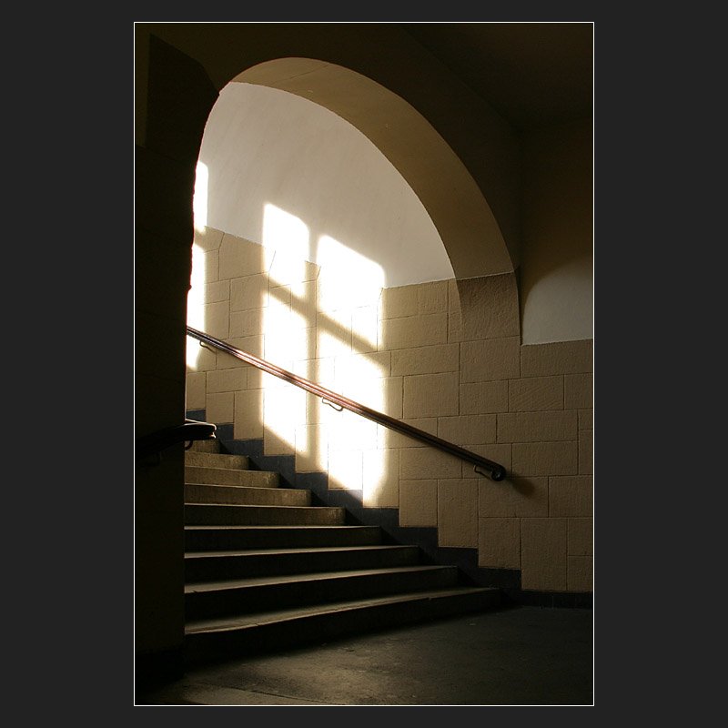 Hier ist es ein Bahnsteigzugang, es könnte auch ein Treppenhaus in einem Schulhaus sein - was auch immer, oft geht man achtlos vorbei, auf dem Weg nach oben, doch wie ich sehe lohnt es sich, anzuhalten und zu betrachten, was es zu betrachten gibt: Faszinierende Formen, Licht und Schattenspiele, harmonisch vereint.